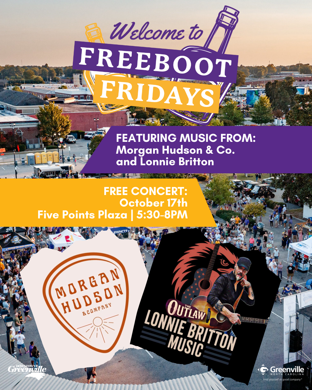 Downtown Greenville Partnership and the City of Greenville invite the community to join us for the next Freeboot Friday on October 17, following ECU’s home game against Tulsa.