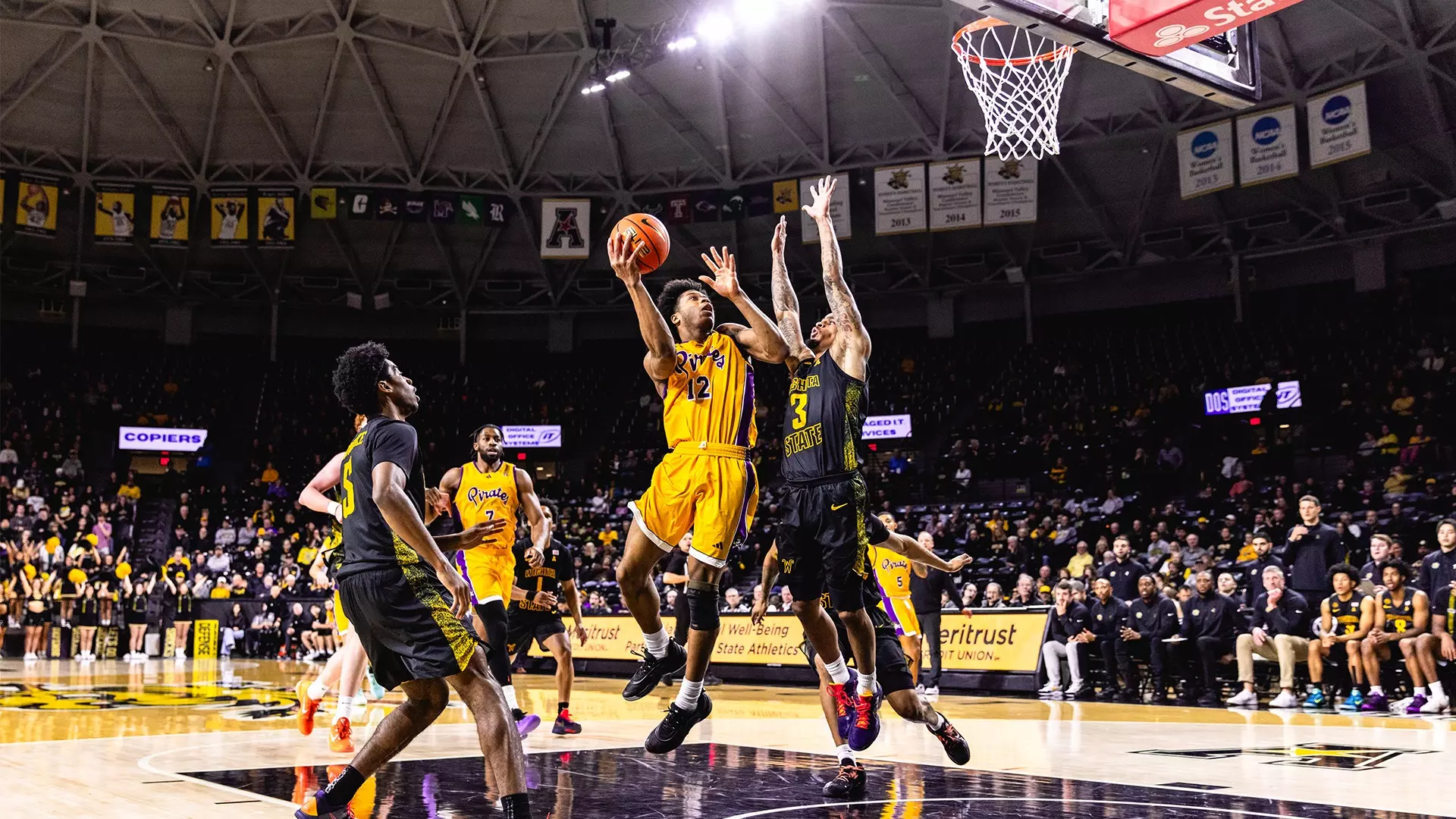 The Shockers scored the game’s first five points until Gardner got the Pirates on the board with a floater at 18:28 in the first half. Wichita State’s hot start continued into the first media timeout as the Shockers hit their next four shots to take a 14-6 lead.