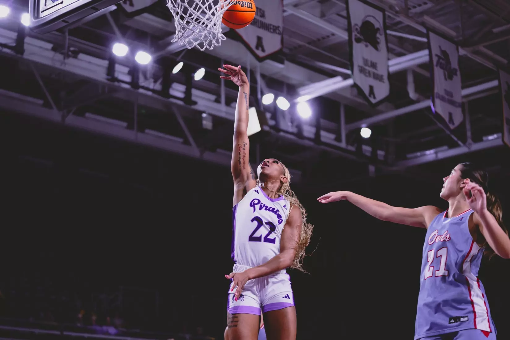 The Pirates got the decisive play with under a minute left when Jayla Hearp took a flagrant foul and finished the bucket anyway to push the margin back into double figures. Though she missed both of the foul shots, Hutton sank both of hers on the ensuring desperation foul by the Owls.
