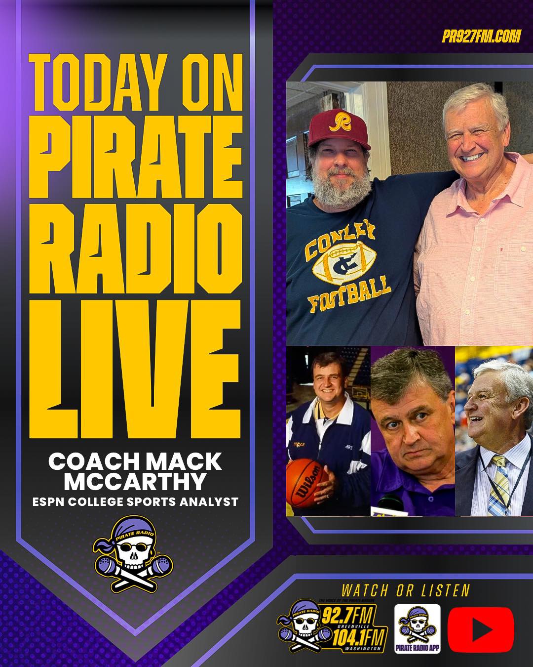 Pirate Radio Live airs each Monday-Friday from 3-6 p.m. on 92.7 FM in Greenville and 104.1 FM in Washington.